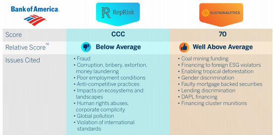 For example, two of the main ESG scoring systems – RepRisk and Sustainalytics – rate the same company extremely differently, one giving Bank of America an above average score, and the other drawing the opposite conclusion.