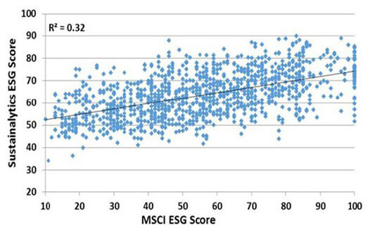 This is not just a one-off case: CSRHub ran a regression of ESG scores from Sustainalytics and MSCI across 1200 global companies. Surprisingly the correlation between the two rating providers was just 32%.