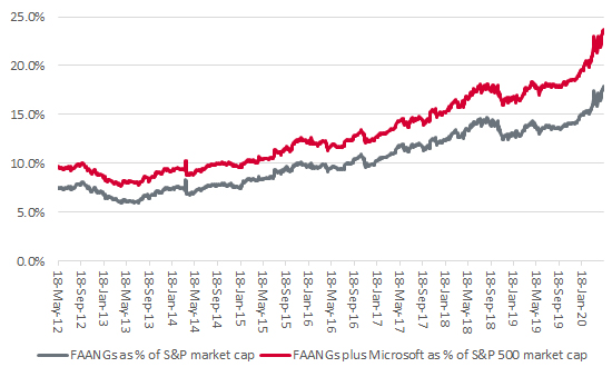 “As a result of their stunning long-term performance, Facebook, Amazon, Apple, Netflix and Google’s parent Alphabet are now worth almost 18% of the S&P 500 on their own (and twice as much as the entire FTSE 100).”