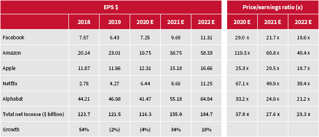 “If consensus earnings forecasts of a 34% leap in profits in 2021, followed by a 19% surge in 2022, prove accurate, the FAANGs could well remain all-conquering. But consider that aggregate net income fell 2% in 2019 and is forecast to drop 4% in 2020.”