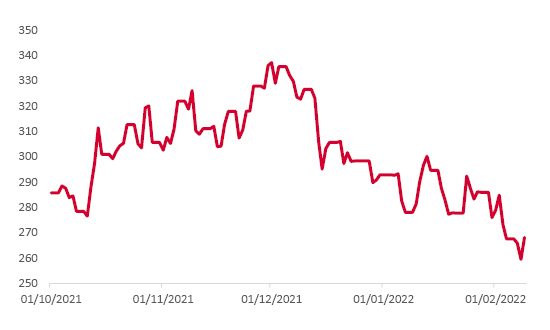 In February 2022, the Bank of England forecast that inflation would reach around 7% by springtime. It then expects inflation to move back towards the 2% target over the course of the next two years. The idea that inflation is ‘transitory’ is a view still largely priced into the market, although the spectre of persistent inflation has crept into the lexicon of more and more investors over recent months. One popular index used to measure this is the 5y5y index. This is average expected inflation over a 5-year period, starting 5 years in the future. This is calculated from looking at interest rate swaps, a derivative used by institutional investors to hedge against inflation risk, so can be described as the inflation rate ‘priced in by the market’.