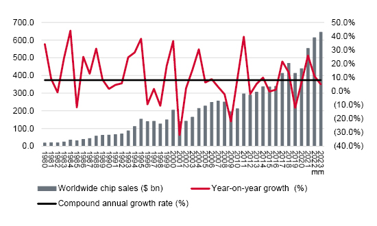 Global silicon chip sales have shown an impressive 8% compound annual growth rate over the past 40-odd years, a figure which easily surpasses worldwide GDP growth trends. However, the industry is notoriously boom-and-bust.