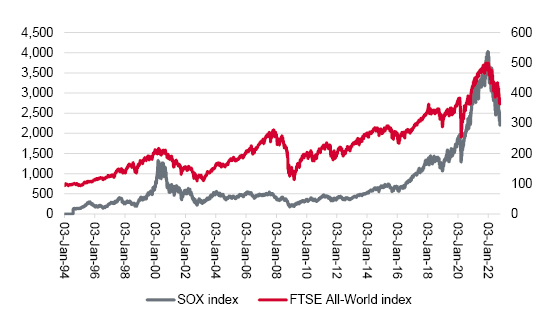 A forward price/earnings multiple of 15 times for 2023 and 13 times for 2024 looks interesting, but that assumes the earnings forecasts are accurate (and the underlying premise of broadly flat operating margins of 36% from 2022 to 2024 does look flawed given the industry’s volatile history). It now remains to be seen whether the SOX retains its status as a valuable early-warning signal of better or worse economic and stock market conditions ahead. Peaks in the SOX called broader market tops in 2000 and 2006 and bottoms heralded better times ahead in 2002, 2008, 2018 and 2020.