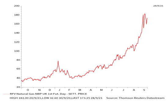 There’s a myriad of reasons for the surge. These run from last year’s cold snap – which ate into UK stocks – delayed maintenance on oil platforms – which has led to decreased supply – and a disappointing contribution from renewables over the summer, all while demand has been increasing as global economies reopen.