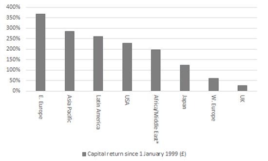 Source: Refinitiv data. Capital return in sterling terms. *MSCI Africa/Middle East since inception in September 2003.