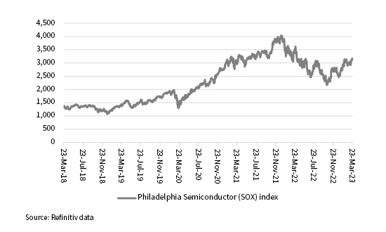 The first indicator is this column’s old friend the Philadelphia Semiconductor index, or SOX. The silicon chip industry is worth $600 billion a year and chips are everywhere from smartphones to cars and robots to laptops, while chip stocks are beloved by momentum players who feast off earnings upgrades and recoil from downgrades. The SOX was early to price in 2022’s recession fears. It now seems to be pricing in a renewed upswing in activity.