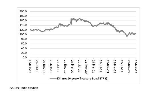However, that could also be indicative of the worst of all worlds – stagflation. The ETF which tracks long-dated US Treasuries seems to be frightened of this, looking at its soggy price chart.