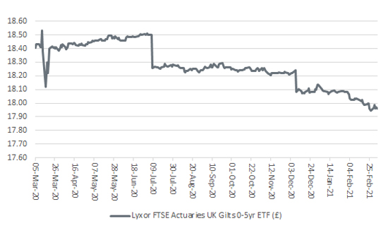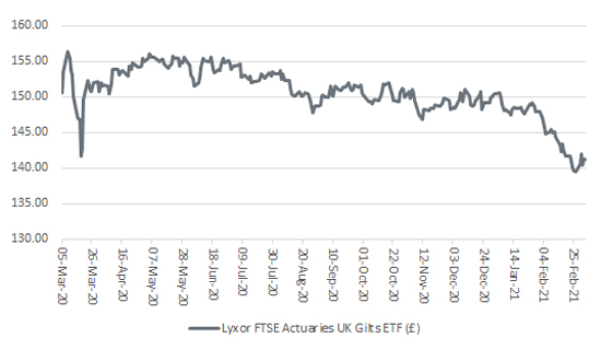 Meanwhile, the ETF which tracks and delivers the performance of a wider basket of UK Gilts (once its running costs are taken into account) has fallen 8% since yields bottomed last summer.