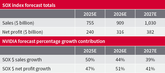 Advisers and clients may have neither time nor the inclination for stock specifics, but NVIDIA represents 48% of the SOX’s aggregate $9 trillion market capitalisation, 27% of forecast sales for 2025 and 45% of analysts’ profit estimates for this year. The company also represents a major chunk of the rapid growth expected from the SOX’s members in total for each of the next three years.