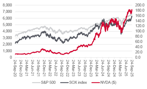 “Advisers and clients may have neither time nor the inclination for stock specifics, but NVIDIA represents 48% of the SOX’s aggregate $9 trillion market capitalisation, 27% of forecast sales for 2025 and 45% of analysts’ profit estimates for this year. The company also represents a major chunk of the rapid growth expected from the SOX’s members in total for each of the next three years.”