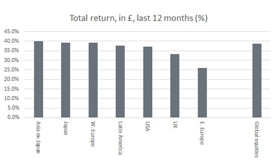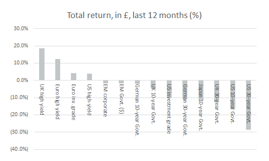 Incredible as this would have seemed a year ago, ‘risk’ assets are showing the best total returns in sterling-denominated terms over the 12 months, as equities and commodities easily outpace bonds. Within fixed income, the riskiest option – high-yield corporate paper – continues to lead Government and investment-grade corporate debt.
