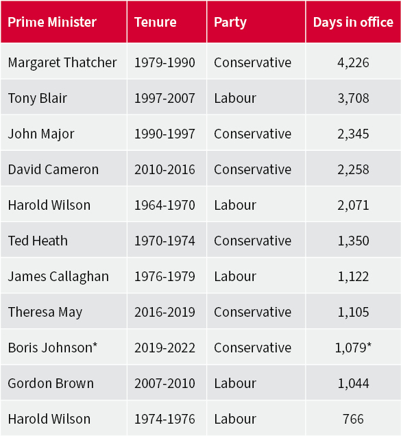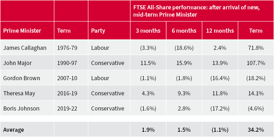 Since the inception of the FTSE All-Share in 1964, five Prime Ministers have taken office mid-way during a Parliament, following the departure of their predecessor – James Callaghan and Gordon Brown for Labour, in 1976 and 2007, and John Major, Theresa May and Boris Johnson for the Conservatives in 1990, 2016 and 2019 respectively.