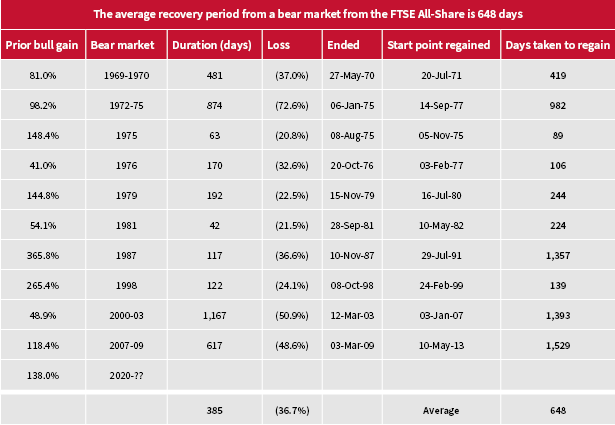 The average recovery period from a bear market for the FTSE All-Share is 648 days