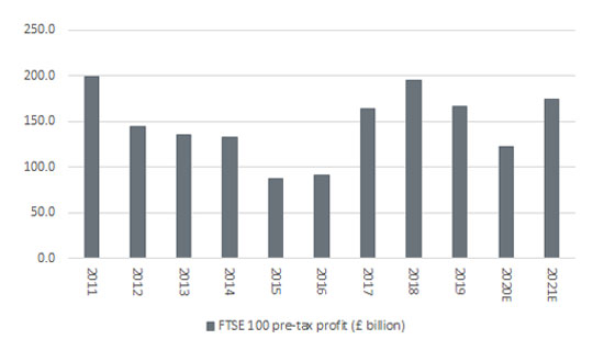 Taking an aggregate of the bottom-up forecasts for all 100 members of the UK’s premier index, analysts are currently expecting a sharp rebound in pre-tax profit, to £174.2 billion in 2021, from 2020’s £122.2 billion.