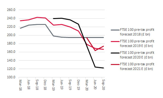 • The first is how the 2021 forecast compares to recent history. An outcome of £174.2 billion in 2021 would take next year’s pre-tax profit total for the FTSE 100 to a level 5% above that of 2019 and one just 10% below 2018’s all-time high. Investors must weigh the effects of the pandemic, the efficacy of policy response and how corporate and consumer behaviour may (or may not) change as part of their analysis here.
