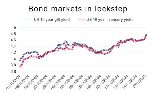 There are no easy answers to the question of why markets move, especially over a short time frame, and sometimes it’s simply a matter of momentum. However, the fact yields are rising on both sides of the Atlantic does suggest the new year has brought with it a focus on the incoming US president, and the potential for his trade and immigration policies to be inflationary, which has implications for both economies. Bond investors might also be looking at the giant stacks of government debt already on the books on both sides of the pond and saying thanks, but no thanks.