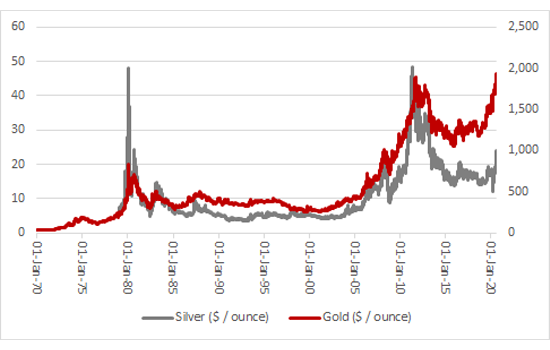 At the time of writing, gold is setting new record highs above $1,900 an ounce but, at $24 an ounce, silver is still trading way below its prior peaks of 2011 and 1979, even if silver’s 34% year-to-date gain in 2020 outpaces that of gold by several percentage points.