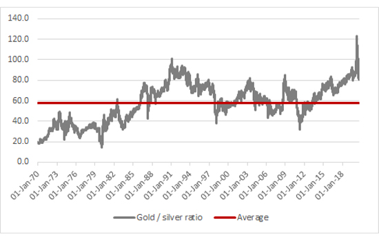 As the world focuses ever-more intently on renewable sources of energy, solar panels could be a big driver of silver demand. Whether this proves more potent than demand for a haven remains to be seen, but historical data does suggest silver is trading cheaply relative to gold. The gold/silver price ratio has averaged 56 since 1970 but an ounce of gold currently trades at 80 times the price of an ounce of silver.