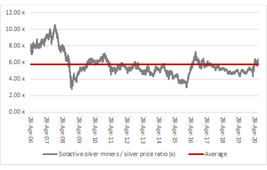 Unlike gold miners, however, while the HUI Golds Bugs index trades below its average ratio to the metal price, silver miners do not look especially cheap compared to the physical commodity, on the basis of the relationship between the metal and the Solactive Silver miners index.