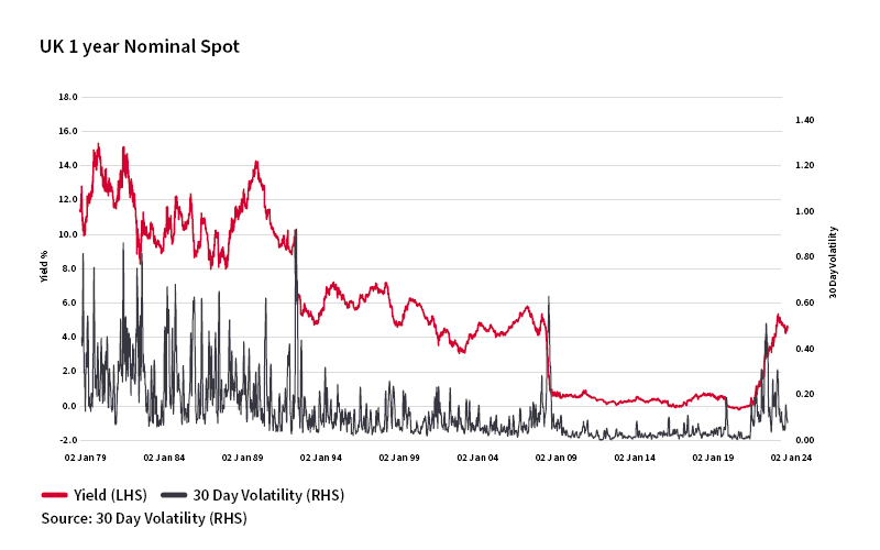 Each monthly inflation reading carries great weight for market expectations of interest rates and results in a lot of market noise. Bond markets remain volatile as a result however, historically speaking, this may be more like a return to normal rather than a new paradigm. As can be seen in the chart below of the spot 1 year UK gilt yield, its rolling 30-day volatility now appears similar to before the Global Financial Crisis.