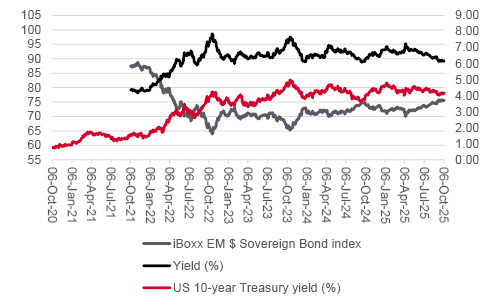 The spread between EM sovereign yields and US Treasuries continues to narrow