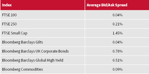 For example, rather than buying a product tracking the FTSE 100, you can also invest in products tracking the FTSE 100 equal-weighted index, where all holdings are held in the same proportion. This small adjustment increases the bid/ask spread by 56%. Although, in this case it is still relatively small at 0.06%, it is still an increase in liquidity risk. When navigating the myriad of indices, especially those with tilts towards small cap and value, do not take at face-value the back-tested performance showing that it outperforms the standard index (such as the FTSE 100). Instead, understand that a large part of the outperformance is due to the liquidity premium!