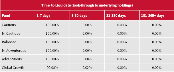 As can be seen, based on the liquidity of the underlying liquidity of the securities within the ETFs, with the exception of 0.02% in the Global Growth Fund, all holdings could be liquidated within a week based on trading up to 25% of the daily volume of the securities – a percentage that is estimated to have minimal impact on the prices of securities.
