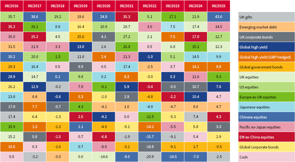 Turning back to the ‘patchwork’, there are trends that have been made and broken over the decade. Gilts and government bonds had a good first five years, before inflation and higher interest rates saw them trampled for much of the second five years. Another observation is that, although sentiment and flow has been against UK equities, they have produced respectable returns in several years, in fact, in double-digits in the last two years to the end of August.