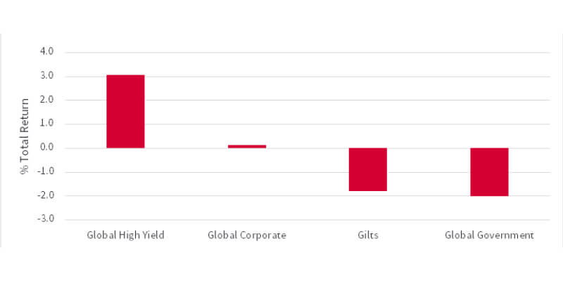 The market went into 2024 expecting up to six interest rate cuts from the US Federal Reserve this year, however by the end of the quarter the consensus had shifted be more aligned with policy makers’ expectations of just three cuts. This, and two higher-than-expected US inflation prints, conspired to shift yields higher across the US curve. Most global government bond yields followed, however shorter-dated yields in the UK were kept in check by inflation readings that came in a touch below expectations. In corporate bonds, credit spreads tightened to provide insulation from the move higher in rates.