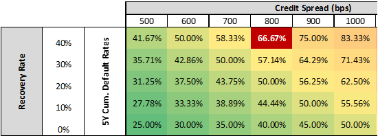 The extra return above government bonds for the Bloomberg Barclays Global High Yield Index sat at 8% on 12 May. If we assume a 40% recovery rate on default, this lets us infer that two thirds of bonds within the index will go bust in the next five years: