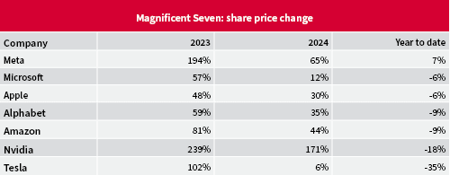 Excitement around AI was a key driver for this group of shares over the past few years, either as enablers or beneficiaries. Microsoft, Alphabet and Amazon were all about growth in cloud computing and Meta was driven by successful use of AI to improve user engagement on its social media platforms.
