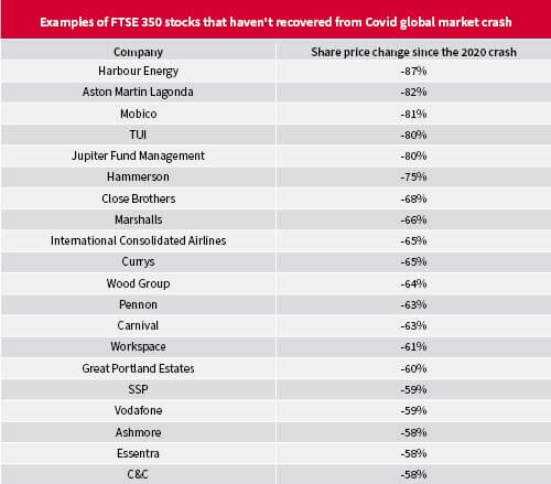 Examples of FTSE 350 stocks that haven't recovered from Covid global market crash