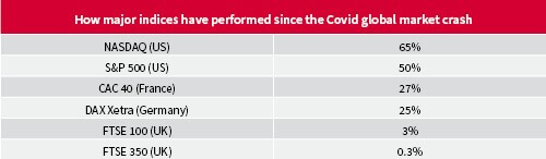 In contrast, the FTSE 350 is now trading 0.3% higher while the S&P 500 has achieved significantly greater returns, up 50%. On a broader basis, the FTSE 100 is trading 3% ahead while the Nasdaq index in the US is up 65%. Even other parts of the world are thriving – France’s CAC 40 is 27% ahead and Germany’s DAX is trading 25% higher, for example.