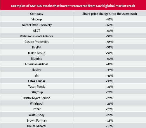 Examples of S&P 500 stocks that haven't recovered from Covid global market crash