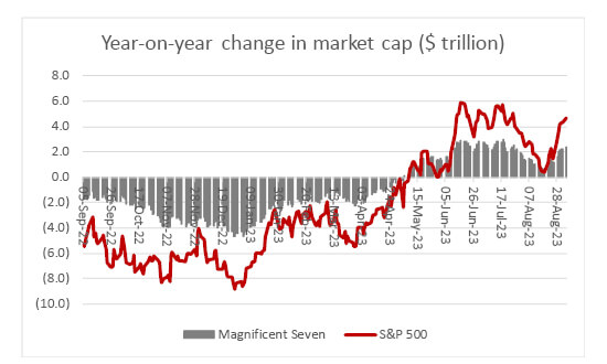 • Equities seem to be pricing in a return to the ‘Goldilocks’ economy of the 2010s, where low inflation, low growth and low interest rates prevailed. Nothing ran too hot, and everything felt just right, at least if a portfolio was heavily exposed to long-term growth plays such as technology companies, which were highly prized for their ability to increase earnings whatever the economic conditions. America’s stock market is heavily weighted towards tech, and it is outperforming again in 2023, as seen by how the increase in the market capitalisation of the so-called Magnificent Seven of Alphabet, Amazon, Apple, Meta Microsoft, NVIDIA, and Tesla is responsible for the vast bulk of the advance in total US market cap this year.
