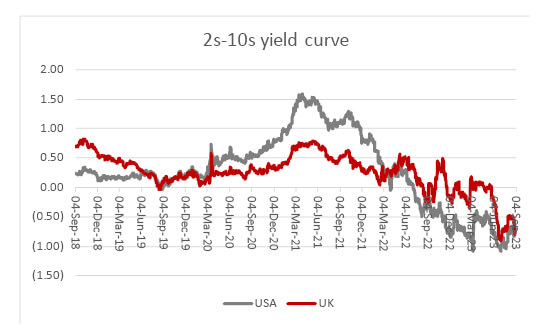 • Fixed-income markets remain convinced a recession is coming. The yield curve remains steeply inverted in both the US and UK, as ten-year Government bonds offer a lesser yield than their two-year equivalents. This is usually seen as a warning that a slowdown is coming, because bond investors are pricing in future interest rate cuts in response to the downturn.