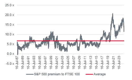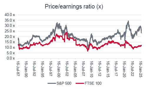 In addition, analysts’ consensus profits forecasts assume 14% earnings growth from the S&P 500 in each of 2025 and 2026. By contrast, FTSE 100 aggregate earnings are seen coming in flat in 2025, before a 13% recovery in 2026, after three fallow years.