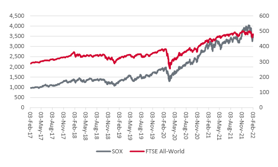 Such optimism may explain why the SOX’s 30 constituents command an aggregate market capitalisation of $3.3 trillion (even if certain key Korean and Japanese players do not feature). That figure represents nearly seven times the firms’ forecast $472 billion in aggregate sales for 2022 and 24 times analysts’ estimates for total net earnings of $135 billion.