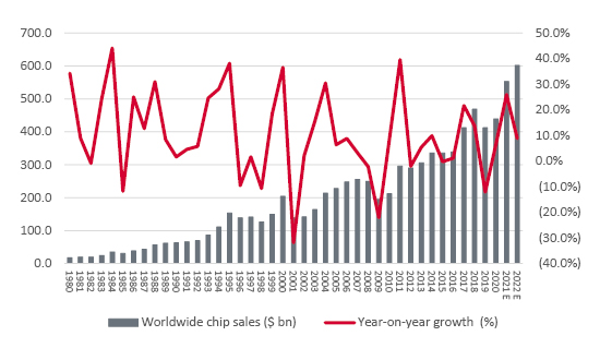 That sudden loss of momentum seems odd given the apparently rosy outlook for the industry. Industry bodies such as the WSTS and SIA believe global chip sales rose by more than a quarter in 2021 to reach a new all-time high of around $550 billion. They also expect a further increase of some 9% to $600 billion for 2022, still above the industry’s long-term compound annual growth rate of 8% a year.