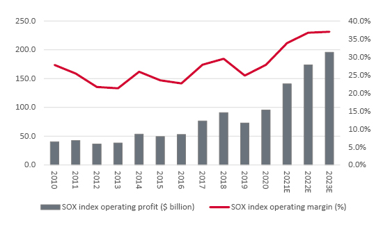 SOX index members’ operating profits and margins are expected to keep rising …. and rising