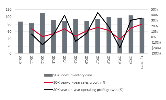 The second possible clue comes from inventories. Inventory days across the 30 SOX members reached an eight-year high of 104 in 2020. Thankfully that figure had retreated to 96 by the end of Q3 2021 and it had done so without affecting profits (note how digesting lofty inventories hurt sales and industry earnings in 2012).