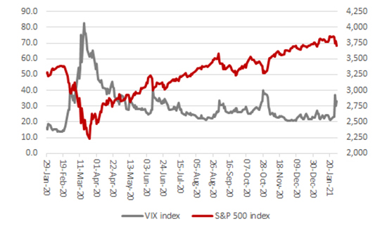 The spike in the VIX, or ‘fear’, index that accompanied the stampede into GameStop and trampling of hedge funds’ positions by retail investors (at least to some degree) is therefore equally eye-catching, especially in the context of overall US equity market valuations, which on some metrics look very lofty by historic standards, as discussed by this column last week (SHARES, 28 January 2021).