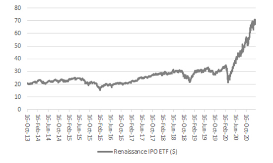 But it is not just old, previously downtrodden stocks that are feeling the love. Market newcomers are receiving plenty of adulation, too. This can be seen in US-traded Renaissance IPO Exchange-Traded Fund (ETF), which is designed to mirror the returns from 80% of the market capitalisation of the universe of companies that have gone public in America within the last two years, minus its running costs. Airbnb (ABNB:NDQ) and DoorDash (DASH:NYSE) were both added at the last quarterly review in December. The ETF currently tracks 49 stocks and it is up by a third since November, helped by strong early gains in those two recent market entrants. Investors snapping up IPOs for the early share price ‘pop’ and to make a quick gain can also sometimes be a sign of a frothy market.