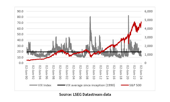It bears repetition that markets are currently pricing in lower inflation, a soft landing (or even no landing at all) and rate cuts for 2024. Any developments that diverge from that – in the form of a hard landing or an inflationary, crack-up boom if central banks move too precipitately – might not mean the bull run in US equities ends, but they could surely portend greater share price volatility. The VIX – or fear – index is lurking at barely 13, well below its historic average of near 20, to suggest markets are at best complacent, at worst exuberant.