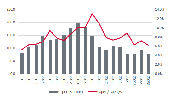 “The combined capital investment budgets of the seven Western oil majors – BP, Chevron, ConocoPhilips, ENI, ExxonMobil, Shell and TotalEnergies – looks set to drop to its lowest mark since 2005, as a percentage of sales.”
