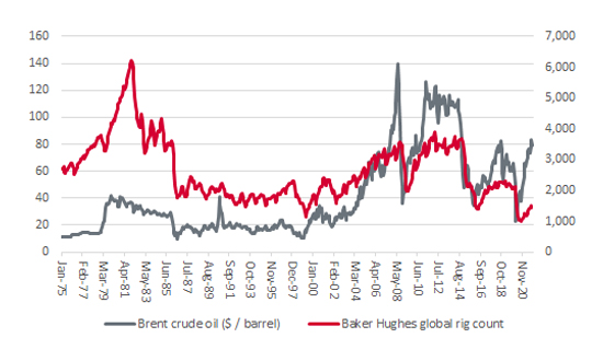 Global oil rig activity is subdued relative to prior periods of $80-plus oil