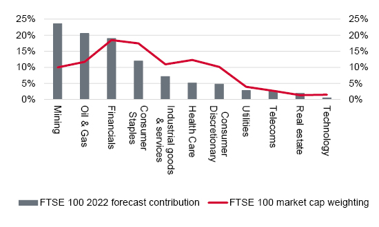 The importance of these three sectors becomes even more clear when their percentage contribution to earnings growth is quantified. Oils and miners are expected to provide 71% of FTSE 100 earnings growth in 2022 but financials are not expected to contribute anything, thanks to a return to taking loan loss provisions this year, compared to 2021’s writebacks.