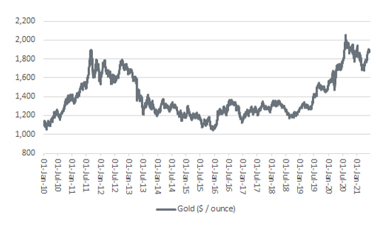 “Gold’s inability to progress to new highs is reminiscent of its struggles to crack $1,300 between 2013 and 2019 and fits with the view of central banks that the current spike in inflation is merely ‘transitory’.”