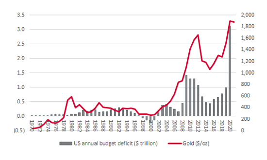 But history suggests Government spending and rising deficits – or profligacy as some gold bugs might term it – are good for gold because investors look for stores of value to preserve their wealth. Gold is hard to find and costly to mine, so supply grows slowly, in contrast to the supply of money.