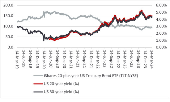 “Bond markets are paying attention. The iShares 20-year Plus Treasury Bond Exchange-Traded Fund, which has the ticker TLT:NYSE, is down by nearly 8% from its December high, as long-dated US Treasury yields go higher once more, in a rout that is wiping out two years’-worth of coupons at a stroke.”